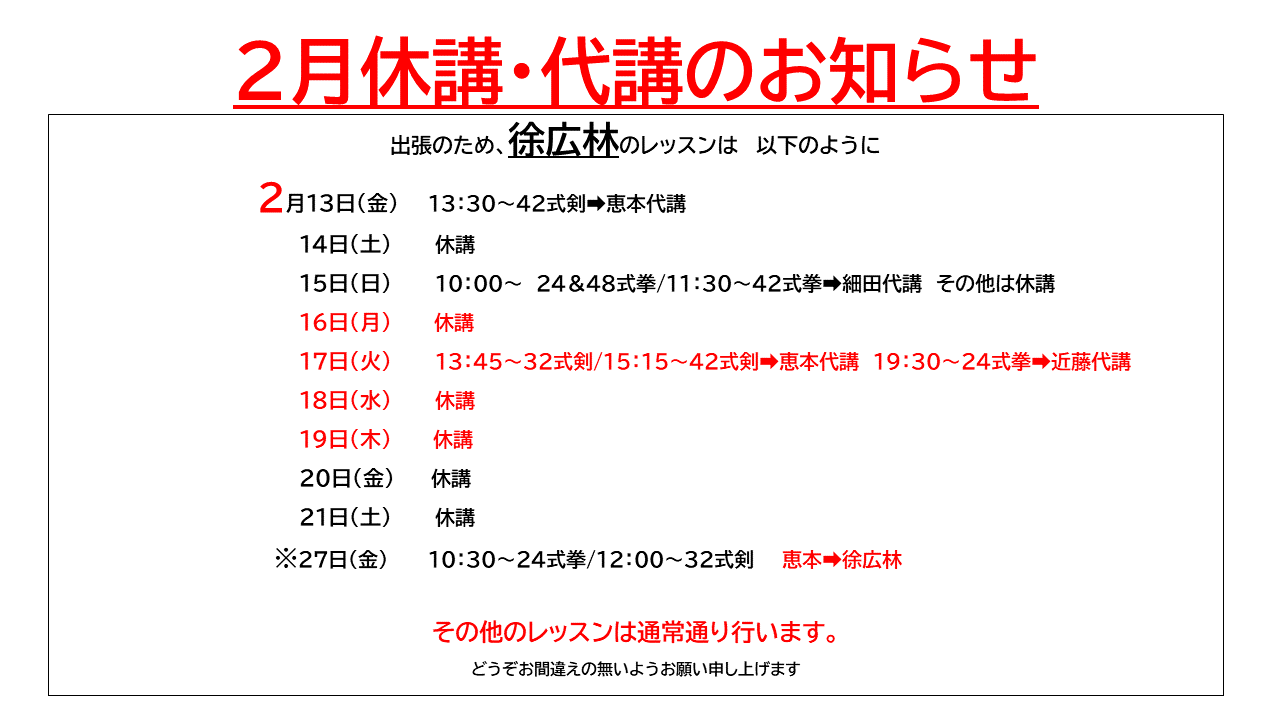 2026年2月代講・休講のお知らせ